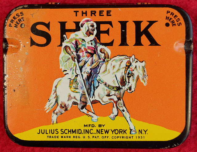 Some interesting history: Silver screen idol Rudolph Valentino appears on this condom tin. He played a sheik in 1921’s silent movie “The Sheik,” and it became one of his most well-known roles. When his picture appeared on Sheik condoms, prophylactic sales then skyrocketed as average men wanted to get what he had for themselves.