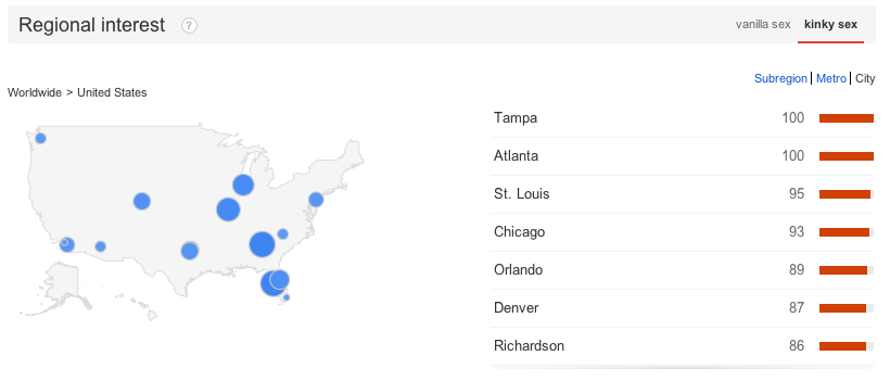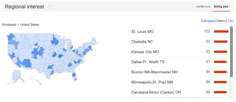 It’s difficult to draw any concrete conclusions from the findings. It appears that Googling kinky sex is widespread and not limited to any particular region, metro area and/or city.