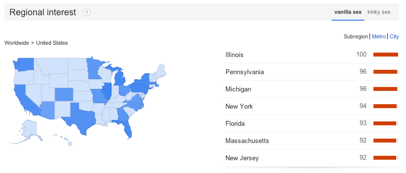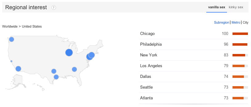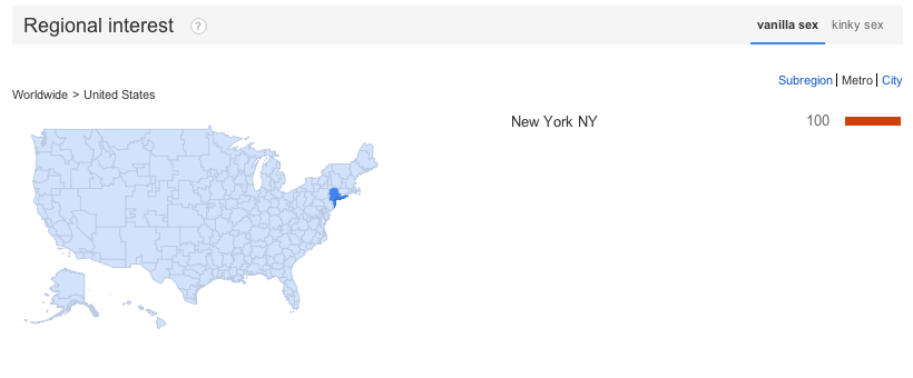 Yeah, this doesn’t look comprehensive. I find it very hard to believe that New York is the only metro area Googling “vanilla sex,” considering I found that the same metro area was madly Googling sexy Halloween costumes last month.